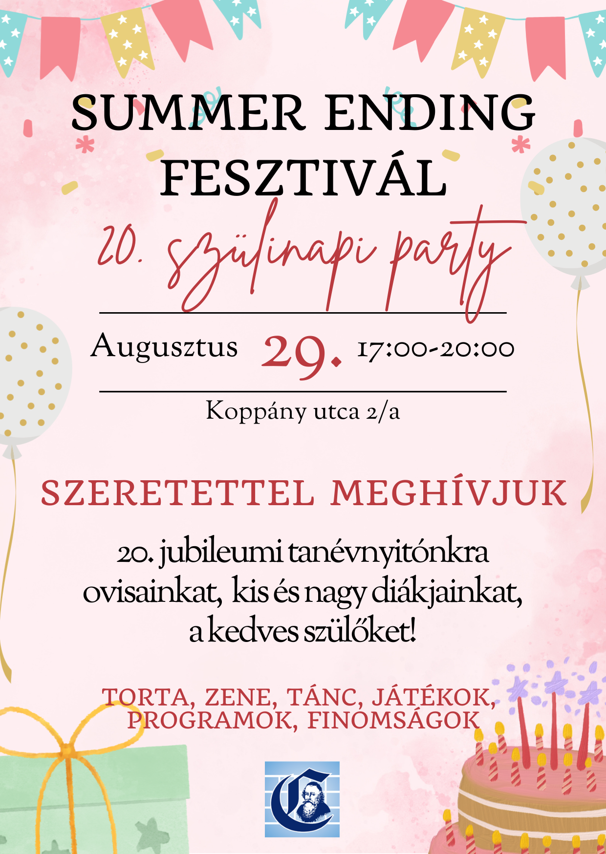 Szeretettel várjuk Önöket iskolánk 20. jubileumi tanévnyitó rendezvényére. A Summer Ending Fesztiválon, iskolánk születésnapi party-ján.